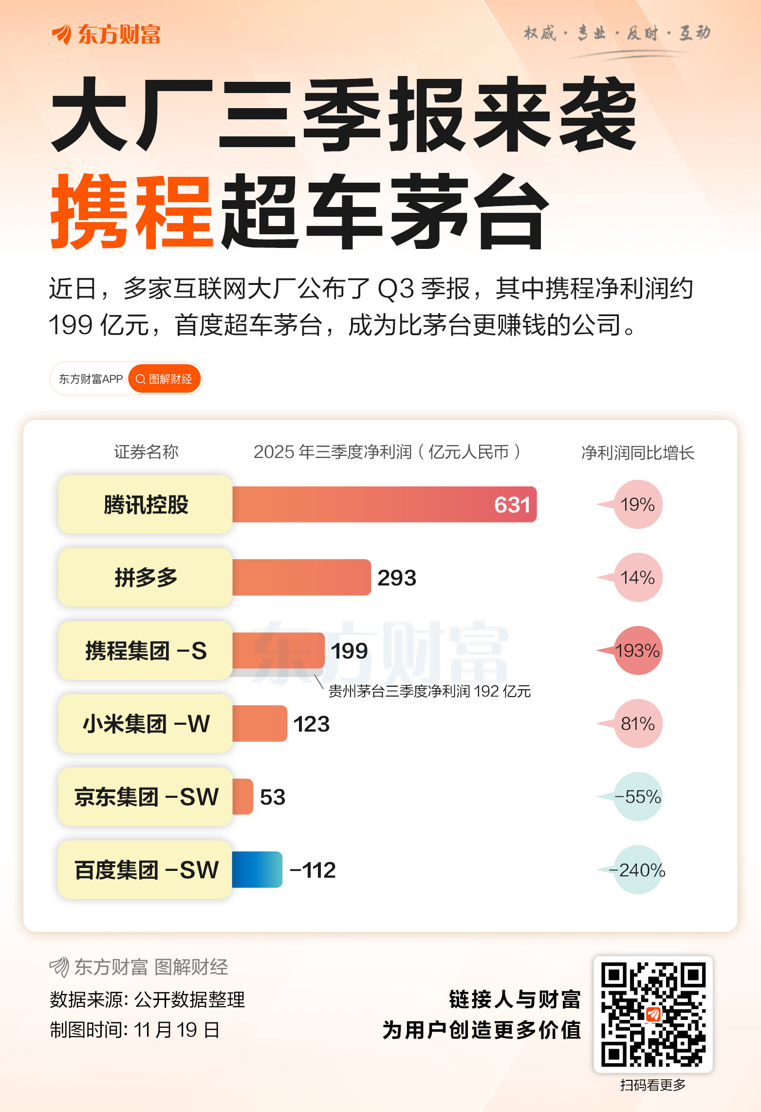 在净利润同比增幅方面,携程集团表现最为亮眼。财报显示,今年第三季度,携程净营业收入183亿元,同比增长16%;归母净利润199亿元,同比增长192.6%。值得注意的是,这是携程的净利润首次超过茅台,成为比茅台更赚钱的公司。