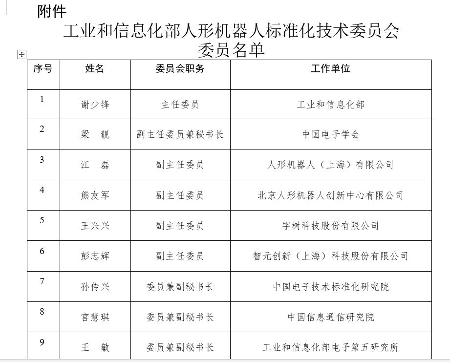 人形机器人标准化技术委员会委员名单(部分)。图片来源:工信部网站