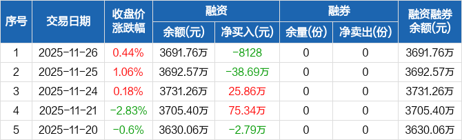 融资方面,当日融资买入28.25万元,融资偿还29.06万元,融资净偿还8128元。融券方面,融券卖出0份,融券偿还0份,融券余量0份,融券余额0元。融资融券余额合计3691.76万元。