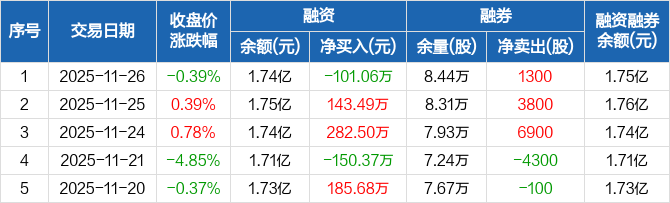 融资方面,当日融资买入513.04万元,融资偿还614.11万元,融资净偿还101.06万元。融券方面,融券卖出1700股,融券偿还400股,融券余量8.44万股,融券余额21.69万元。融资融券余额合计1.75亿元。
