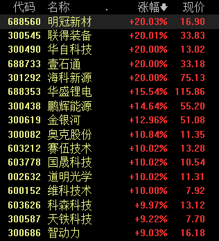 固态电池概念掀涨停潮,明冠新材、联得装备、海科新源、华自科技等10股封板。