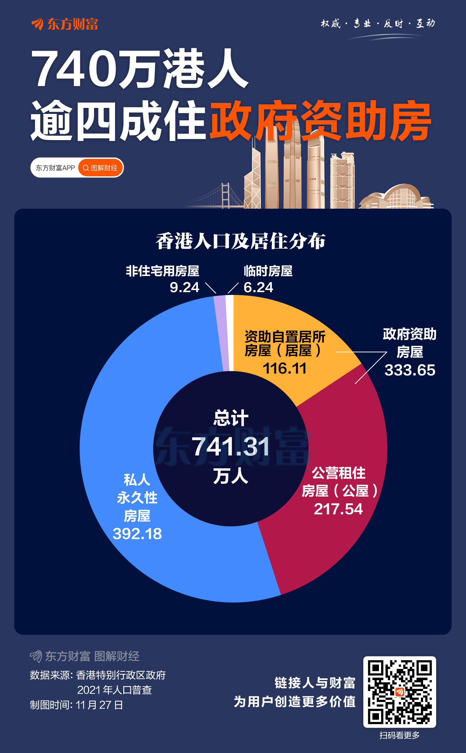 据香港特别行政区最近一次人口普查(即2021年)数据,741万香港居民中,入住居屋的有15.7%,入住公屋的占29.3%,也就是说,有45%的香港居民居住在政府资助房屋。