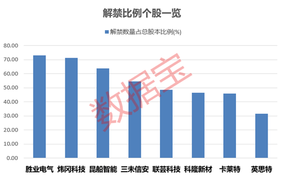 解禁比例来看,胜业电气、炜冈科技、昆船智能、三未信安的解禁比例居前,均超50%。