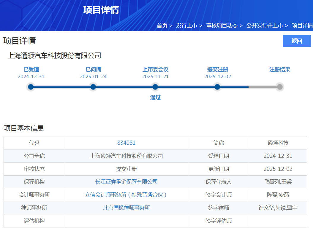 12月2日,北交所官网显示,上海通领汽车科技股份有限公司(以下简称“通领科技”)IPO审核状态变更为“提交注册”。