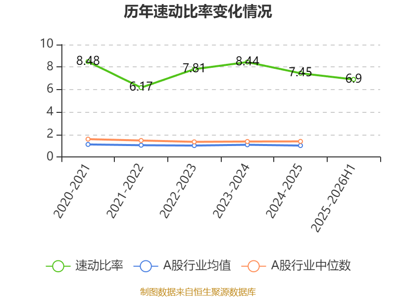 报告期内,公司流动比率为7.45,速动比率为6.9。