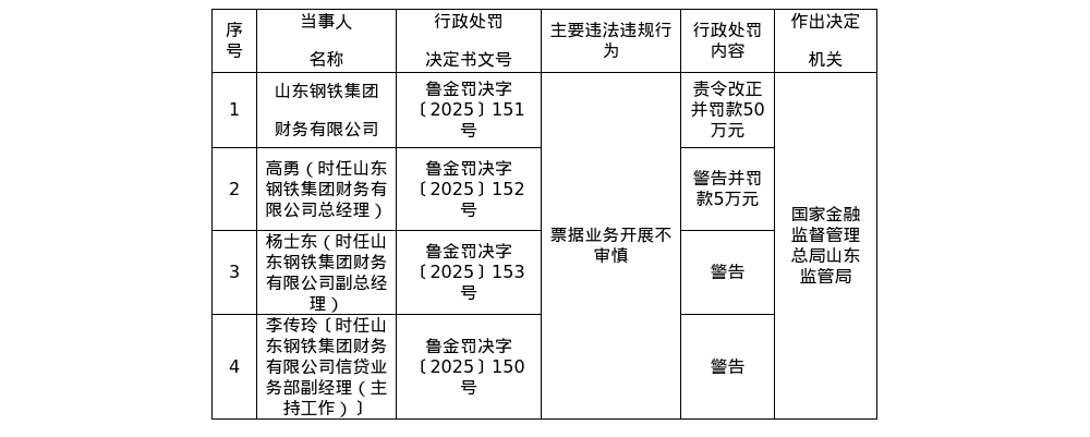 国家金融监督管理总局山东监管局发布了一张罚单,剑指山东钢铁集团财务有限公司及其相关责任人。