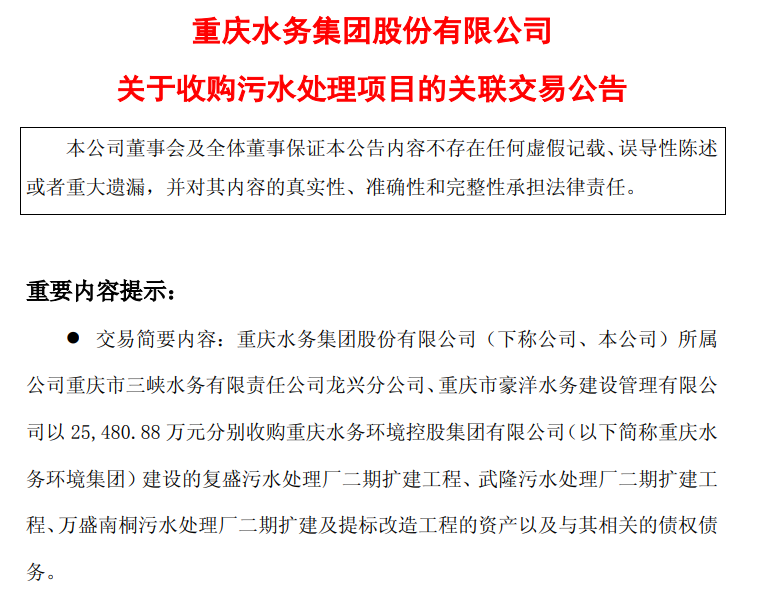 重庆水务表示,本次按公允价值收购重庆水务环境集团三个污水处理项目,有利于减少公司与实际控股股东之间同业竞争,符合公司发展战略和投资方向,有利于巩固公司在重庆市的污水处理服务市场竞争优势,且收购上述污水处理项目是保障水质安全达标排放的需要,不会损害公司及中小股东权益。