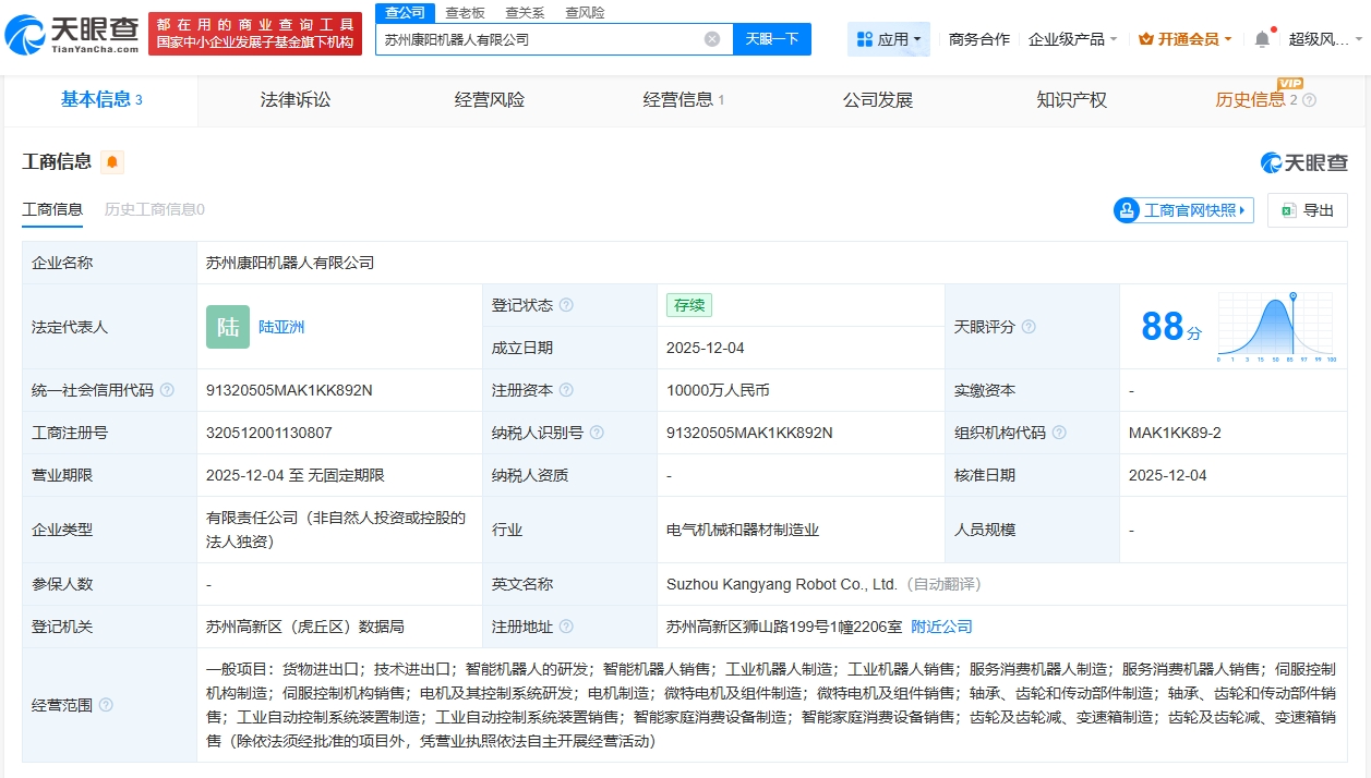 南方财经12月5日电,天眼查App显示,近日,苏州康阳机器人有限公司成立,法定代表人为陆亚洲,注册资本1亿人民币,经营范围包括智能机器人的研发、智能机器人销售、服务消费机器人制造、电机及其控制系统研发等。股东信息显示,该公司由华之杰(603400)全资持股。