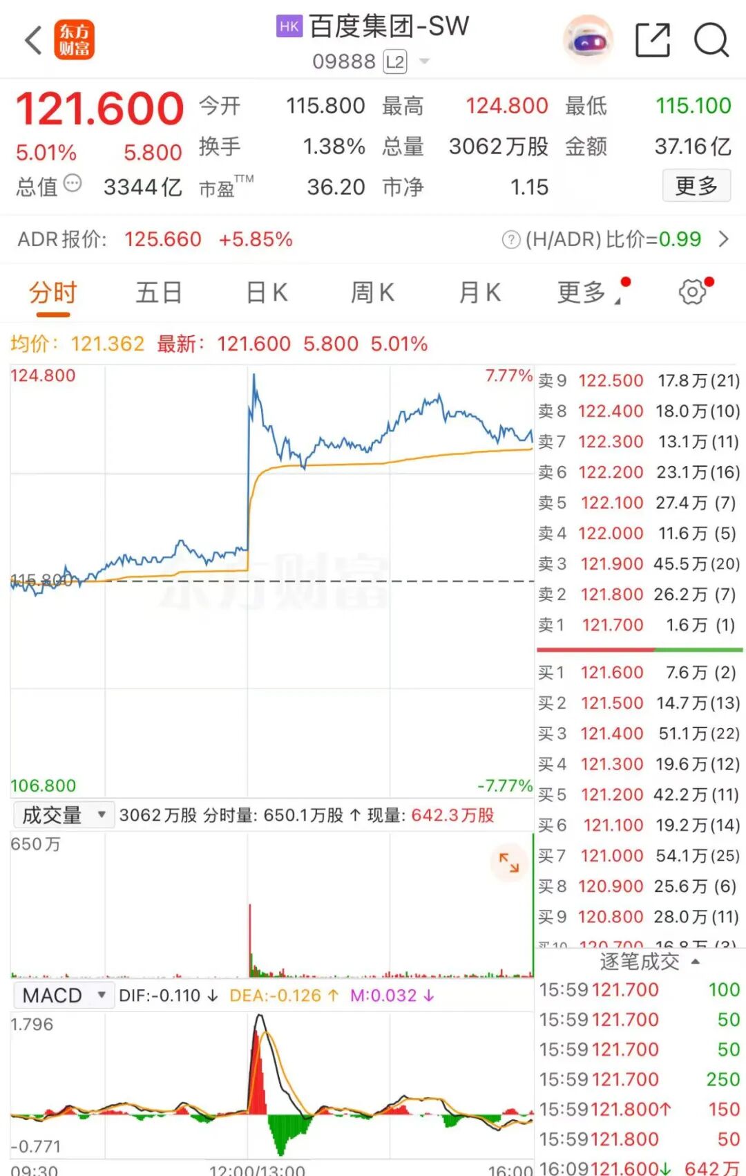 12月5日,百度集团-SW(09888.HK)午后大幅拉涨,一度上涨超7%,截至当天收盘,公司股价涨超5%。