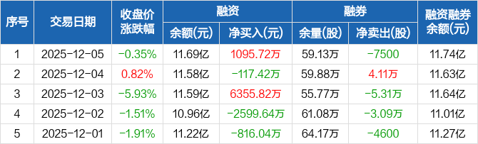 融资方面,当日融资买入1.24亿元,融资偿还1.13亿元,融资净买入1095.72万元。融券方面,融券卖出2500股,融券偿还1万股,融券余量59.13万股,融券余额509.11万元。融资融券余额合计11.74亿元。