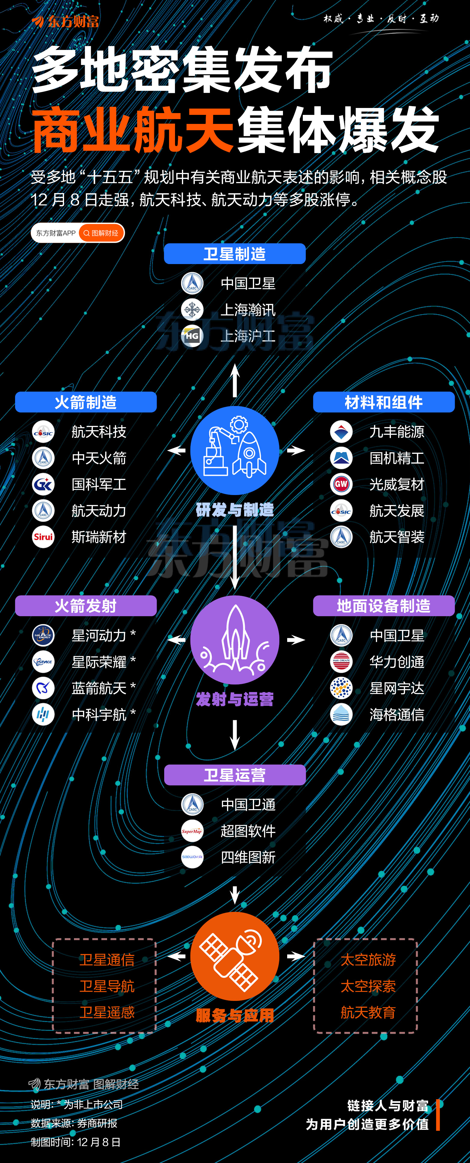 消息面上,多地12月8日披露的“十五五”规划建议中,“商业航天”被频繁提及,比如陕西提出,要加快商业航天、专用装备等产业深耕布局;广东提到,要加快新能源、新材料、商业航天、低空经济等战略性新兴产业集群发展;山东提出,要推动人工智能、集成电路、新能源、新材料、航空航天等产业提质扩量;河南则表示,要围绕低空经济与航空航天等领域,培育壮大战略性新兴产业等等。