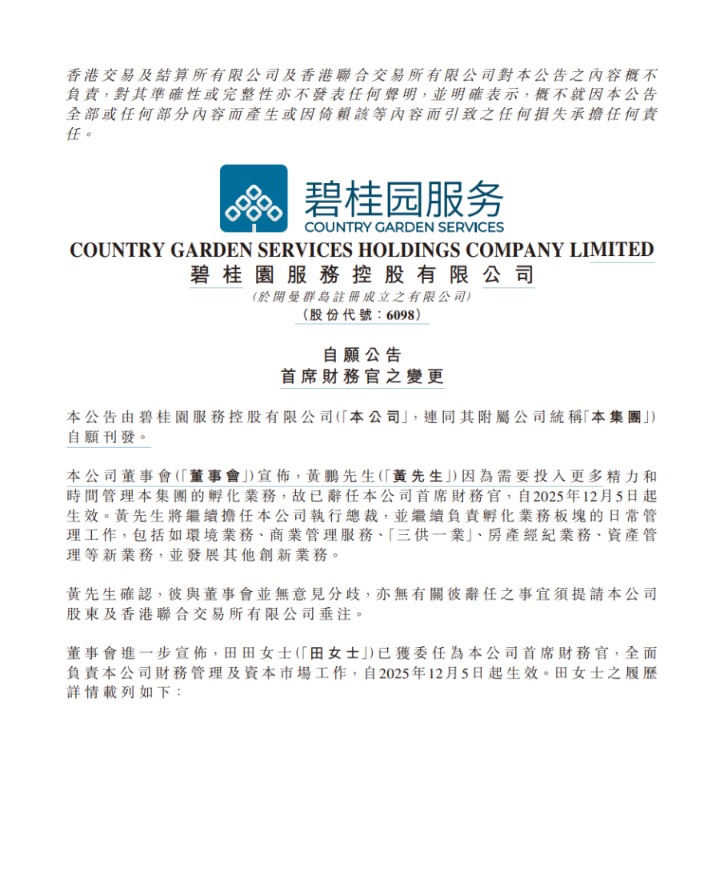 12月7日,碧桂园服务宣布,执行总裁、首席财务官黄鹏因需要投入更多精力和时间管理集团孵化业务,已辞任首席财务官,即日起生效。同时,碧桂园服务聘任田田为新任首席财务官,全面负责公司财务管理及资本市场工作。