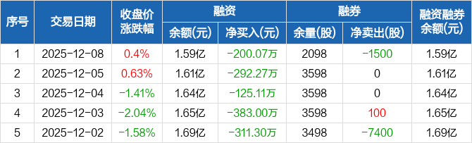 融资方面,当日融资买入1089.23万元,融资偿还1289.3万元,融资净偿还200.07万元,连续8日净偿还累计2679.97万元。融券方面,融券卖出0股,融券偿还1500股,融券余量2098股,融券余额3.71万元。融资融券余额合计1.59亿元。