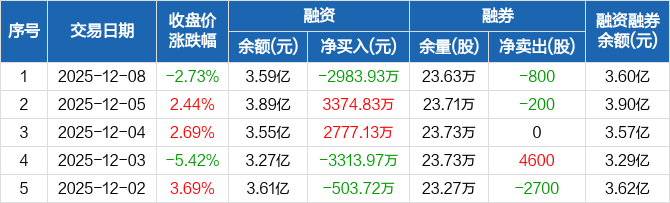 北新路桥融资融券信息显示,2025年12月8日融资净偿还2983.93万元;融资余额3.59亿元,较前一日下降7.67%。