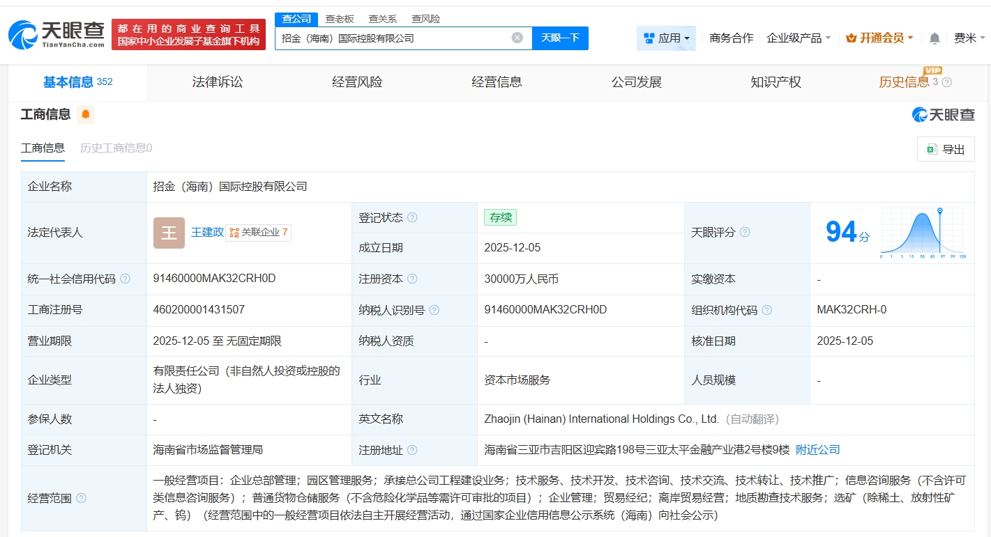 南方财经12月9日电,天眼查App显示,近日,招金(海南)国际控股有限公司成立,法定代表人为王建政,注册资本3亿人民币,经营范围包括企业总部管理、园区管理服务、承接总公司工程建设业务等,由招金矿业(01818.HK)全资持股。