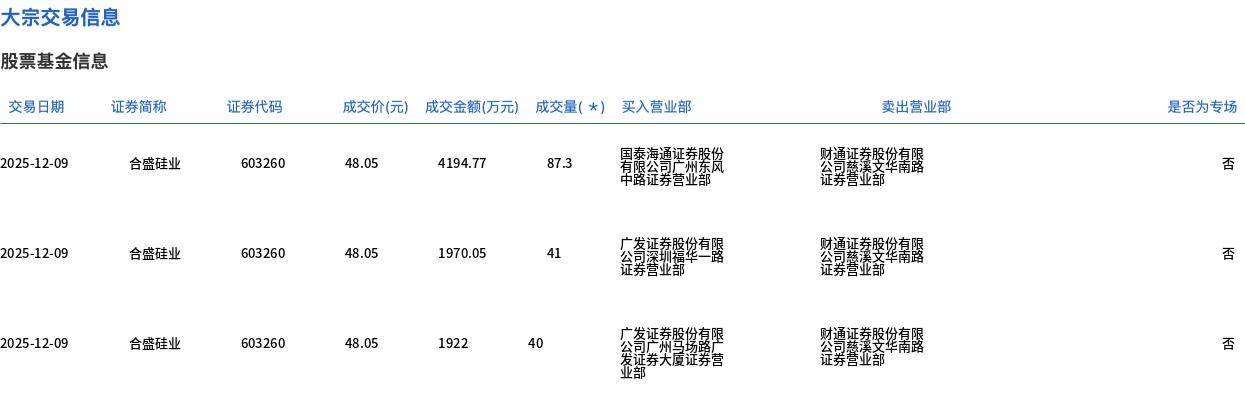 12月9日,合盛硅业大宗交易成交168.3万股,成交额8086.82万元,占当日总成交额的11.26%,成交价48.05元,较市场收盘价54.72元折价12.19%。