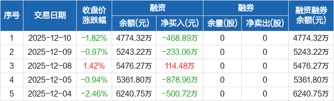 融资方面,当日融资买入351.75万元,融资偿还820.64万元,融资净偿还468.89万元。融券方面,融券卖出0股,融券偿还0股,融券余量0股,融券余额0元。融资融券余额合计4774.32万元。