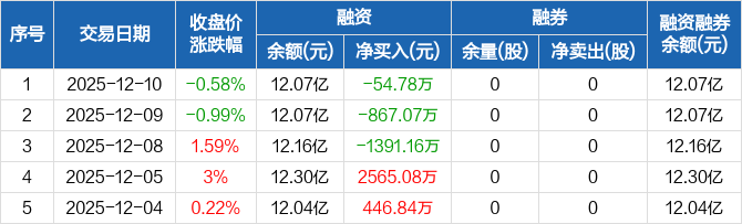 融资方面,当日融资买入3021.64万元,融资偿还3076.42万元,融资净偿还54.78万元,连续3日净偿还累计2313.02万元。融券方面,融券卖出0股,融券偿还0股,融券余量0股,融券余额0元。融资融券余额合计12.07亿元。