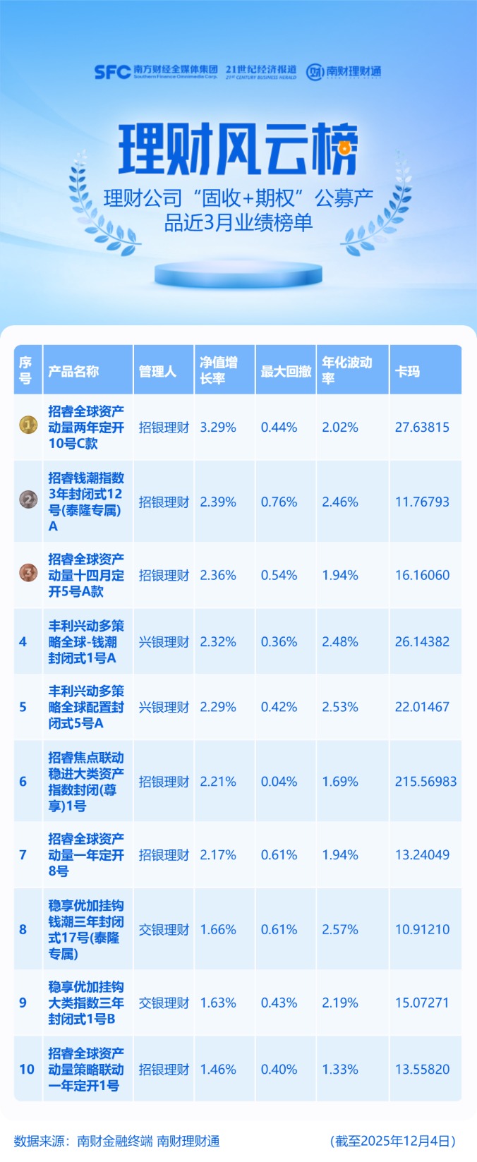 产品统计范围为理财公司发行的公募“固收+期权”理财产品,统计截止日期为2025年12月4日,统计区间为近3个月。