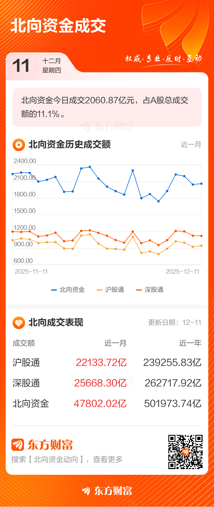 交易所最新数据显示,12月11日北向资金共成交2060.87亿元,占两市总成交额的11.10%。