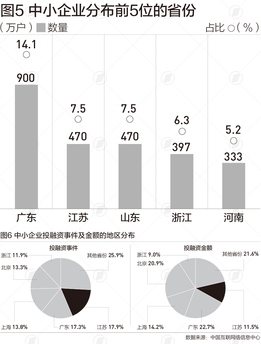 从省份分布看,根据《报告》数据,广东、江苏、山东三个省份中小企业数量总计超过1800万户,占中小企业数量比重近三成。