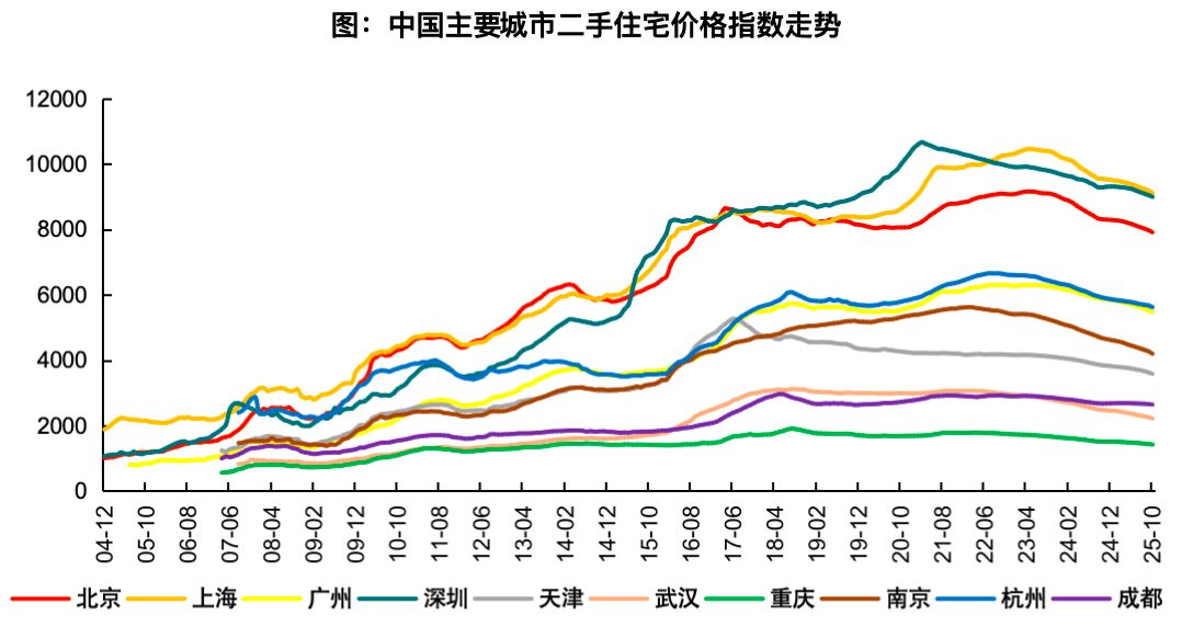 相较而言,二手住宅价格指数波动更加明显。中房指数系统显示,以2004年12月北京价格为1000点,截至2025年10月,上海、深圳和北京二手住宅价格指数分别达9116点、8996点和7910点,尽管2022年以来二手住宅价格出现回调,但累计涨幅仍突出,北京、深圳相比2004年累计涨幅均在700%左右。