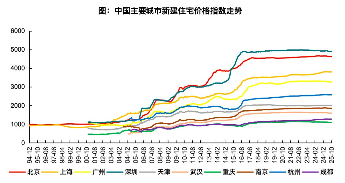 而在过去30年里,中国房地产指数系统(以下简称“中房指数系统”)数据显示,中国主要城市新建住宅及二手住宅价格均实现显著上涨,但不同城市涨幅分化明显。具体来看,截至2025年10月,北京新建住宅价格指数从1994年底的997点上涨至4624点,上海从912点上涨至3799点,深圳从2000年底的1112点上涨至4887点,三个一线城市新建住宅价格指数累计涨幅均在300%以上。