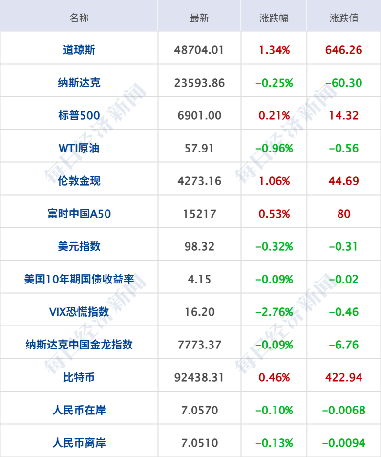 美股三大指数收盘涨跌不一,道指涨1.34%,纳指跌0.25%,标普500指数涨0.21%,大型科技股多数下跌,甲骨文跌超10%,谷歌跌超2%,特斯拉、英伟达跌超1%;贵金属、金属原材料大涨,Vista黄金涨超15%,赫克拉矿业涨超12%,世纪铝业涨超6%;加密货币、半导体板块走低,Robinhood跌超9%,Arm、英特尔跌超3%,Coinbase跌超2%。纳斯达克中国金龙指跌0.09%,中概股涨跌不一,蔚来涨近2%,百度、世纪互联涨超1%,阿里巴巴、知乎、哔哩哔哩跌超1%,小鹏汽车跌超2%。