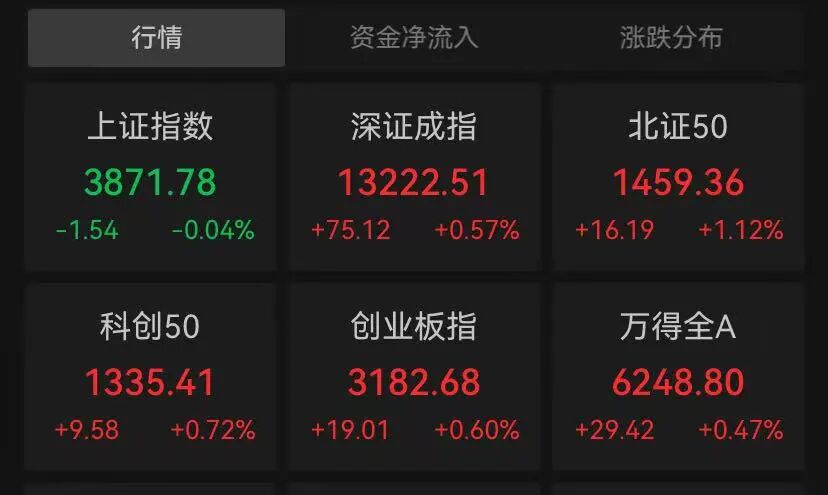 12月12日,A股市场早盘探底回升,创业板指盘中一度涨超1%。截至午间收盘,上证指数报3871.78点,微跌0.04%;深证成指上涨0.57%,报13222.51点;创业板指上涨0.6%,报3182.68点。此外,北交所个股继续活跃,北证50指数盘中拉升涨超2%,截至午间收盘上涨1.12%。