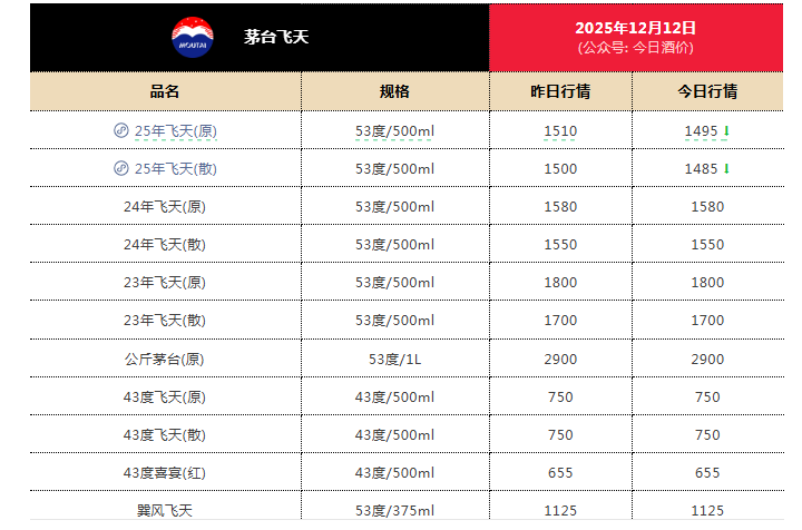 12月12日,“今日酒价”平台披露各大名酒批发参考价显示,2025年款53度500ml飞天茅台原箱较前一日下跌15元,报1495元/瓶;散瓶较前一日下跌15元,报1485元/瓶。