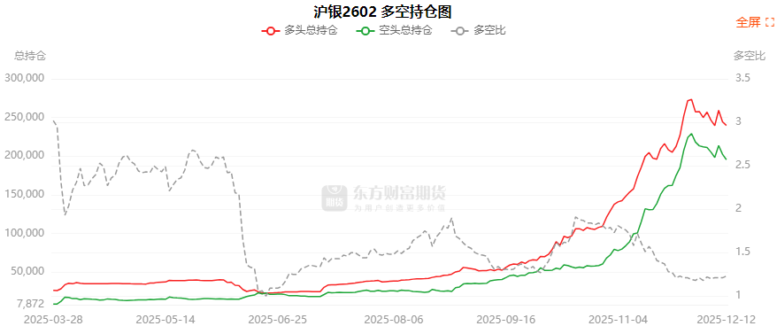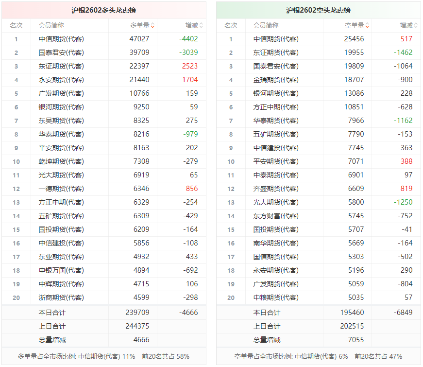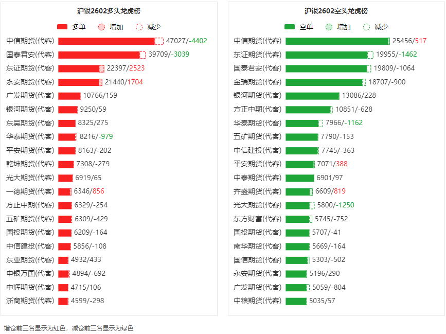 总体而言,沪银2602合约今日减仓上行,多空持仓排名前20席中,多空双方均呈退场态势,多头退场意愿弱于空头。