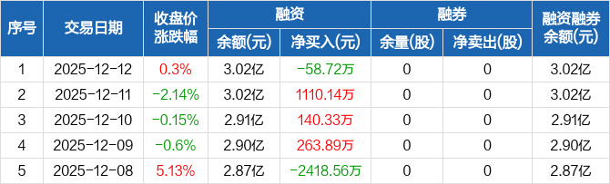 先惠技术融资融券信息显示,2025年12月12日融资净偿还58.72万元;融资余额3.02亿元,较前一日下降0.19%。