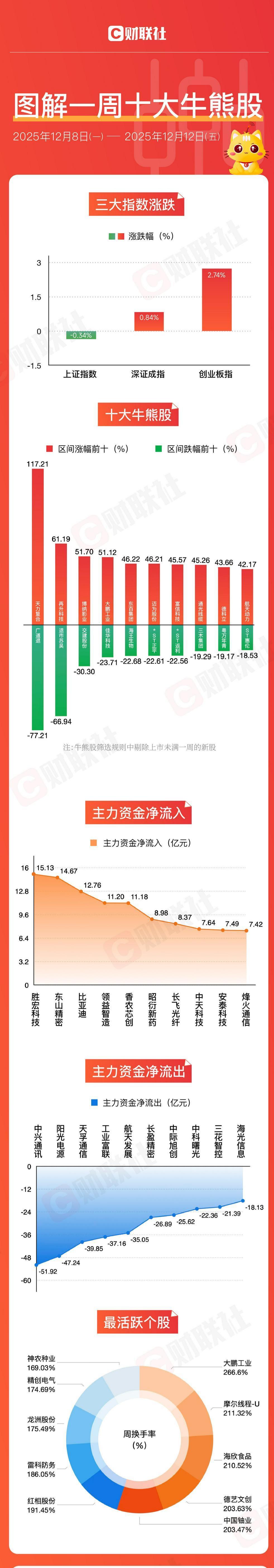 财联社12月14日讯,本周A股三大指数涨跌不一,其中上证指数周跌0.34%,深成指周涨0.84%,创业板指周涨2.74%。本周电子化学品、金属新材料、通讯设备板块涨幅居前,可控核聚变、CPO、商业航天概念股表现活跃。