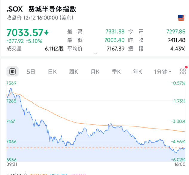芯片巨头博通给出的销售指引不及预期,股价暴跌11%,并拖累同业芯片股,费城半导体指数重挫5%创下数月最大跌幅,进一步加剧了市场对AI押注的焦虑——这种担忧最初由甲骨文触发。作为AI风向标,甲骨文股价从周四开始下挫:公司预计资本开支将上升,且实现收入回报所需时间更长。周五跌势又因一则报道称甲骨文部分数据中心项目出现延期而加深。与AI电力基础设施相关的公司股价也同步走低。