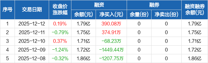 融资方面,当日融资买入2185.91万元,融资偿还1795.83万元,融资净买入390.08万元。融券方面,融券卖出0份,融券偿还0份,融券余量0份,融券余额0元。融资融券余额合计1.79亿元。