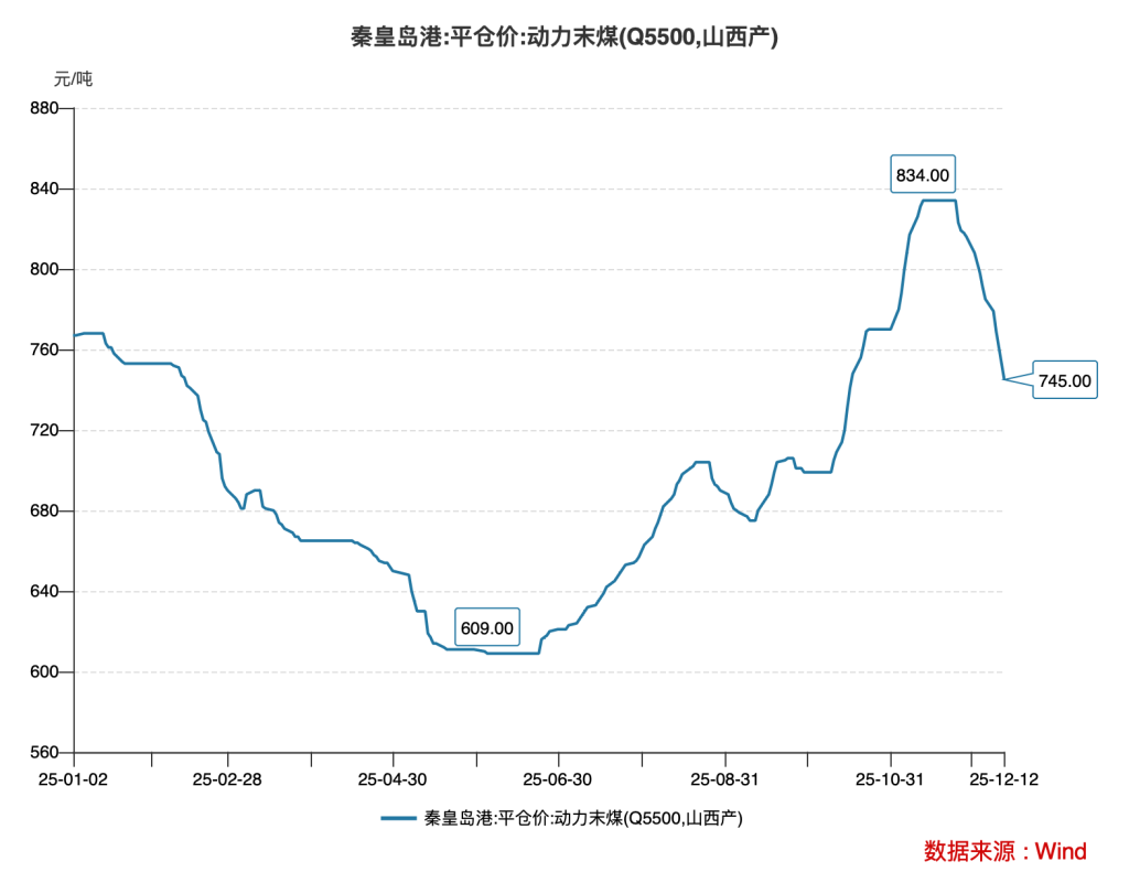 澎湃新闻了解到,今年动力煤价格整体走低,以秦皇岛港5500大卡动力煤现货平仓价为例,截至12月12日,其年内均价为697.03元/吨,较2024年全年均价跌超150元/吨。11月初,动力煤价格年内首次站上800元/吨,但仅维持到当月下旬就开始下跌,12月初跌破800元/吨后仍持续下探。