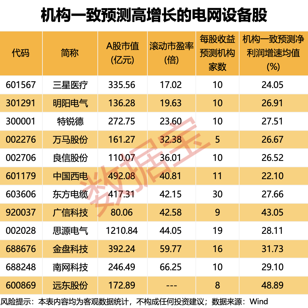 未来增长潜力方面,根据5家及以上机构一致预测,2026年、2027年净利润增速均有望超20%的电网设备股有12只。