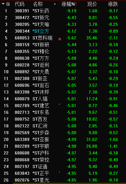 当天各大股指低开低走单边下挫。通达信统计数据显示:当天A股股票涨跌比例是1091∶4302;涨跌幅超过10%的个股比例是42:21;涨跌幅大于5%的个股比例是81:308。盘面看,绩差问题股和缺乏竞争力的品种继续领跌,*ST长药创上市以来的新低,23家主板ST股齐刷刷跌停,其中*ST正平连续10个跌停,*ST返利连续9个跌停。同时,低于2元的个股数量扩营至34只。随机筛选的400家微盘股平均跌幅1.85%,上市1年的次新股平均大跌2.31%。