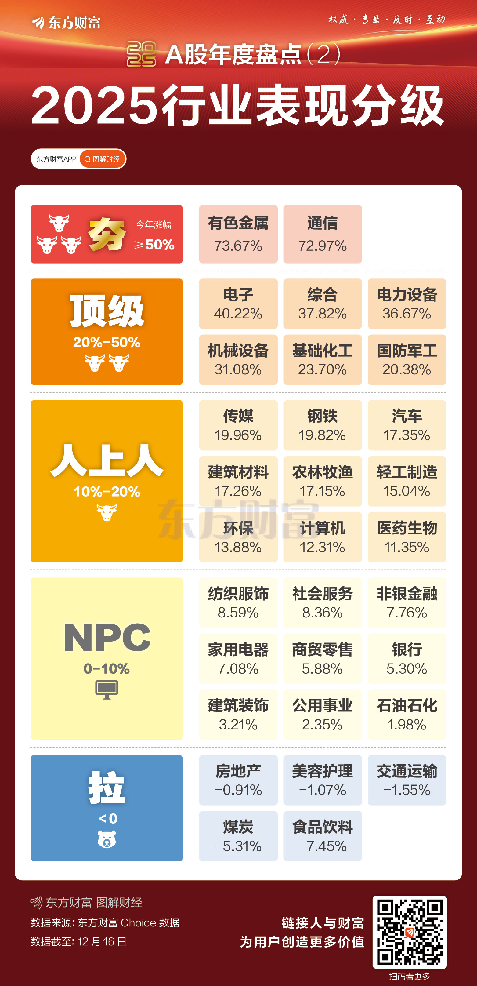 依照当前网络流行的从“夯”到“拉”五档分级(依次为“夯”“顶级”“人上人”“NPC”“拉”,“夯”表示“最受欢迎、超人气、最火”的意思;“NPC”原为称呼游戏中不受真人玩家操纵的游戏角色,此处指没有存在感;“拉”对应“Low”的谐音并衍生出“拉垮”之意),有色金属、通信行业表现堪称“夯”,年内累计涨幅分别为73.67%、72.97%。