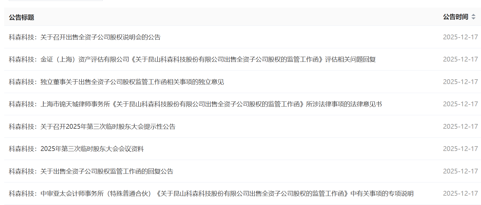 12月16日晚间,科森科技(603626)发布关于出售全资子公司股权监管工作函的回复等系列公告,就上交所关注的公司持续亏损仍卖掉赚钱资产等事宜做出说明。