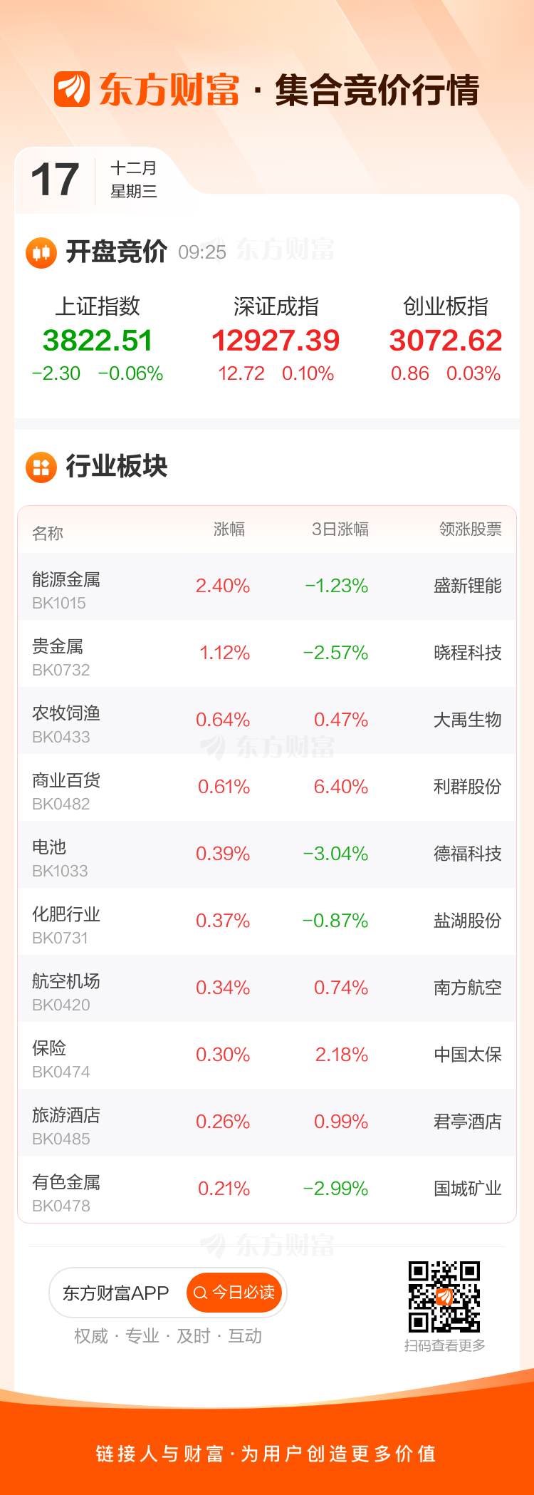 12月17日,三大指数开盘涨跌互现,上证指数低开0.06%,深证成指高开0.1%,创业板指高开0.03%。板块方面,能源金属领涨,盛新锂能涨5.48%,贵金属、农牧饲渔等开盘涨幅居前。