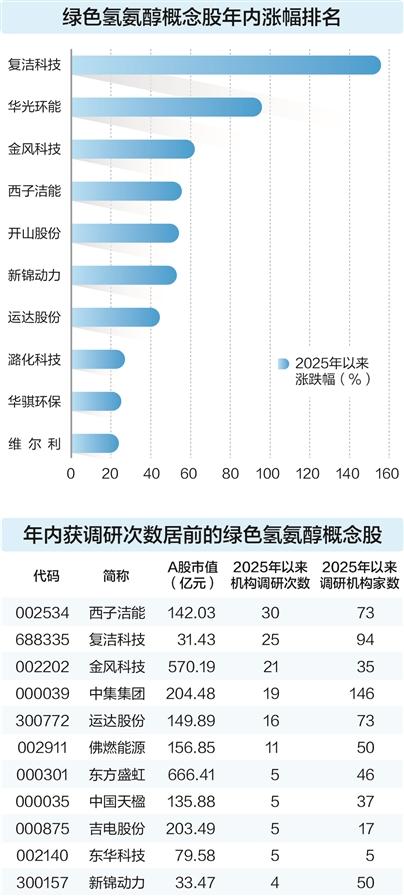 据证券时报·数据宝统计,A股市场上布局绿色氢氨醇相关业务的概念股有17只。截至12月17日,6只概念股年内涨幅超过50%,分别是复洁科技、华光环能、金风科技、西子洁能、开山股份、新锦动力。