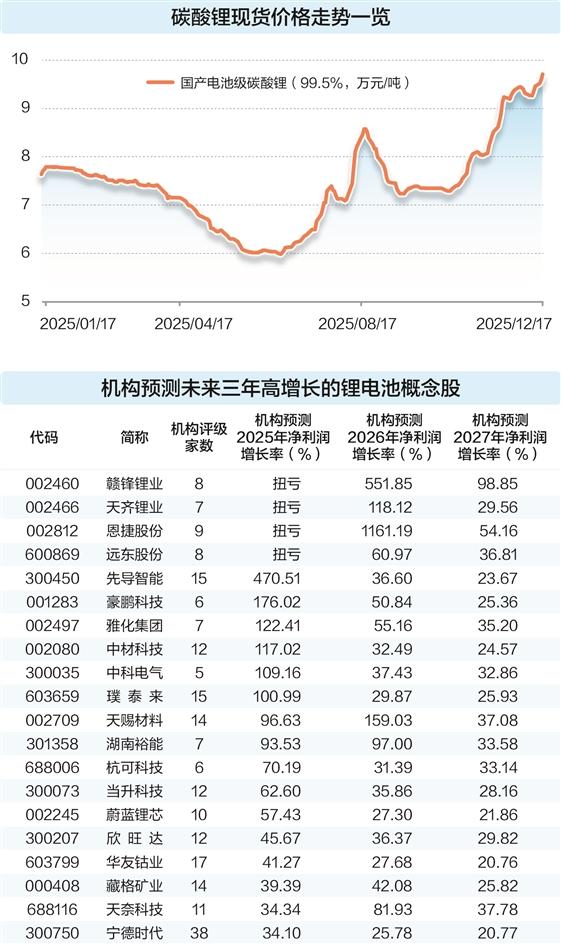 在动力电池持续增长、储能电池需求超预期背景下,机构持续看好锂电池概念股未来前景。根据10家及以上机构一致预测,25股2025—2027年归母净利润增长率有望超过20%,包括宁德时代、赣锋锂业、藏格矿业、华友钴业4只市值千亿元的龙头股。