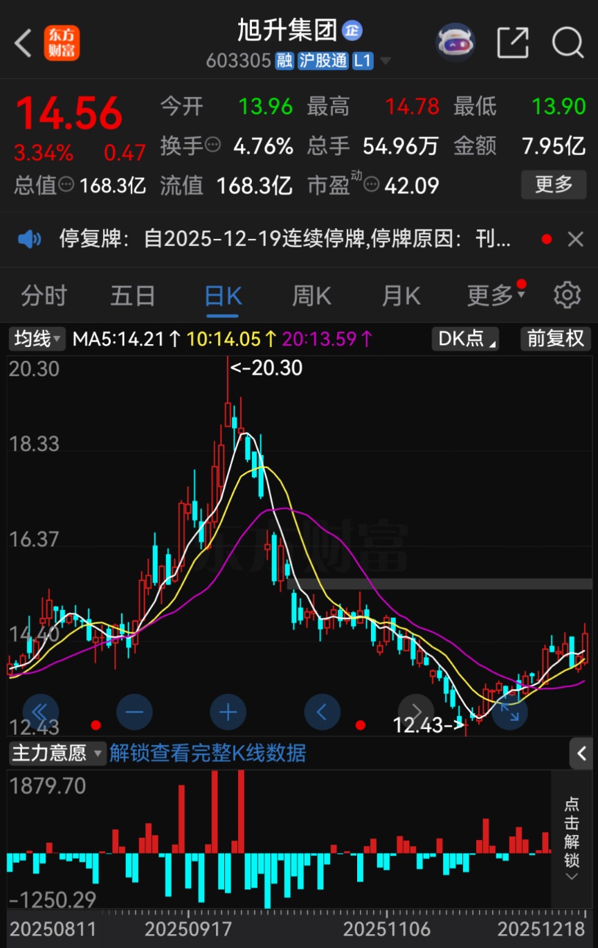 旭升集团计划自12月19日开市起停牌,预计停牌时间不超过2个交易日。截至12月18日收盘,旭升集团股价报14.56元/股,总市值为168.3亿元。