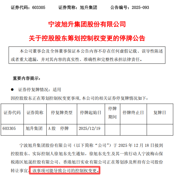 【导读】旭升集团控股股东又筹划控制权变更事项,自12月19日开市起停牌