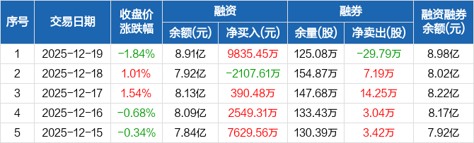 融资方面,当日融资买入1.8亿元,融资偿还8178.55万元,融资净买入9835.45万元,净买入额创12个月新高。融券方面,融券卖出14.32万股,融券偿还44.11万股,融券余量125.08万股,融券余额735.47万元。融资融券余额合计8.98亿元。