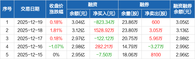 融资方面,当日融资买入1613.16万元,融资偿还2436.5万元,融资净偿还823.34万元。融券方面,融券卖出700股,融券偿还100股,融券余量23.86万股,融券余额134.81万元。融资融券余额合计3.05亿元。