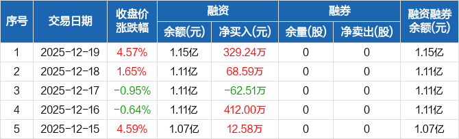 融资方面,当日融资买入1647.81万元,融资偿还1318.57万元,融资净买入329.24万元。融券方面,融券卖出0股,融券偿还0股,融券余量0股,融券余额0元。融资融券余额合计1.15亿元。