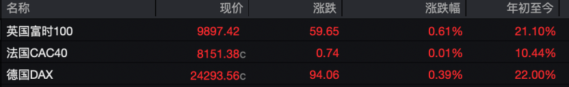 欧洲三大股指收盘小幅上涨,德国DAX指数涨0.39%报24293.56点,法国CAC40指数涨0.01%报8151.38点,英国富时100指数涨0.61%报9897.42点。本周,德国DAX指数涨0.44%,法国CAC40指数涨1.03%,英国富时100指数涨2.57%。