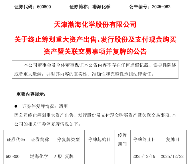 渤海化学(600800)公告称,公司因筹划出售天津渤海石化有限公司(简称“渤海石化”)100%股权、通过发行股份及支付现金的方式购买安徽泰达新材料股份有限公司(简称“泰达新材”)的控制权事项,公司股票于2025年12月8日(星期一)开市起停牌。经审慎研究,公司决定终止本次交易事项,公司股票自2025年12月22日(星期一)开市起复牌。